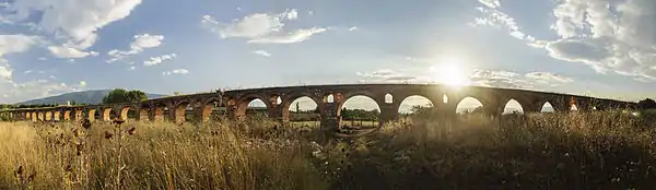 The Skopje Aqueduct (Macedonian: Скопски аквадукт) is an aqueduct and archaeological site located in the neighbourhood of Vizbegovo 2 km (1.2 mi) northwest of central Skopje, North Macedonia. The Skopje Aqueduct is the only aqueduct in Macedonia, and one of three largest and well preserved in the former Yugoslavia along with Diocletianus Aqueduct near Split, Croatia and Bar Aqueduct in Montenegro.