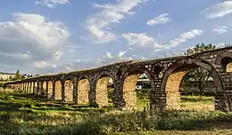 This aqueduct was in use until the eighteenth century. Only about 386 meters (1,266 ft) with 55 arches of this structure of stone and brick remain. It is assumed that the aqueduct took water from the spring Lavovec (village Gluvo in mountain Skopska Crna Gora), 9 kilometers (5.6 mi) northwest from Skopje and brought water to city center.