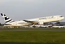 Its sole aircraft, a Boeing 767-300ER, was acquired in June 2013. It had been operated by Martinair.[5][6] Prior starting service to North America, this airline started with charter flights to Somalia, Eritrea, Sweden and United Kingdom. It also did some flights during the Hajj season for Royal Air Maroc and also some flights for Air Madagascar. SkyGreece Airlines employed 160 staff with 100 land based in Greece and 60 as aircrew.[7]