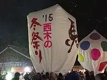 An annual sky lantern festival known as the Kamihinokinai Paper Balloon Festival (上桧木内の紙風船上げ) is held in Semboku, Akita, on February 10 each year. Hundreds of very large lanterns, known as kamifūsen (紙風船), are flown for good luck in the coming year.[10][11] Lanterns are made of washi, traditional Japanese glassine paper. The festival has mythical origins, and was suspended during World War II. It was revived in 1974.[12]
