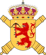 The coat of arms of Småland Artillery Regiment (A 6) from 1977 to 1985. Blazon: "Or, the provincial badge of Småland, a double-tailed lion rampant gules, armed and langued azure, in the forepaws a crossbow gules, arrowhead argent, bow and string sable. The shield surmounted two gunbarrels of older pattern in saltire or. The gunbarrels may be sable."[3]