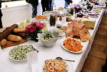 Smörgåsbord became internationally known at the 1939 New York World's Fair when it was offered at the Swedish Pavilion "Three Crowns Restaurant".[1] It is typically a celebratory meal and guests can help themselves from a range of dishes laid out for their choice. In a restaurant the term refers to a buffet-style table laid out with many small dishes from which, for a fixed amount of money, one is allowed to choose as many as one wishes.
