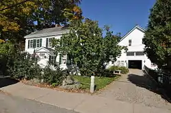 The Smith–Emery House is set on the north side of Main Street, between it and Springvale's mill pond. It is a 2+12-story wood-frame structure, five bays wide, with a side-gable roof, clapboard siding, and a granite foundation. A two-story ell extends to the rear of the main block, connecting it to a barn that is offset to the right. The main (south-facing) facade is symmetrically arranged, with the entrance in a projecting gable-roofed vestibule. The entrance is framed by pilasters at the sides and four-light transom window above. The building interior follows a typical center-chimney plan, with a narrow winding stair in the entry, and parlors to either side. Interior finishes are Greek Revival, and fairly modest.[2]