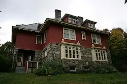 The Smith–Ballou House was constructed in 1906 for two elderly sisters, Mary F. Smith (née Ballou) and Sarah J. Ballou. This 5,000-square-foot (460 m2), three-story house combines Queen Anne and Arts & Crafts style influences, and retains a high degree of integrity of both design and materials. In the first 100 years, the house was owned and occupied by five families. The house initially stood on 5 acres (20,000 m2) of land, subdivided in 1938 such that the house now stands on approximately two acres.[2]