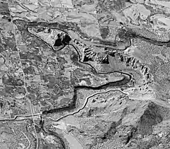 More recently, the Crooked River cut its way through the layers of rock to create today's geographic features. Smith Rock itself is a 3,200-foot (980 m)-high ridge (above sea level) with a sheer cliff-face overlooking a bend in the Crooked River (elev. 2,600 ft = 792.5 m), making the cliffs about 600 feet (182.9 meters) high.[2][4]