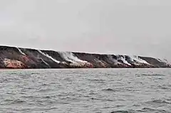 The Smoking Hills are located on the east coast of Cape Bathurst[1] in Canada's Northwest Territories, next to the Arctic Ocean and a small group of lakes. The cliffs were named by explorer John Franklin,[2] who was the first European to see them on his 1826 expeditions. They contain strata of hydrocarbons (oil shales), which have been burning continuously for centuries.