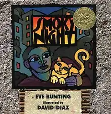 Smoky Night is a 1994 children's book by Eve Bunting. It tells the story of a Los Angeles riot and its aftermath through the eyes of a young boy named Daniel. The ongoing fires and looting force neighbors who previously disliked each other to work together to find their cats. In the end, the cats teach their masters how to get along. The book made the list of One Hundred Books that Shaped the Century compiled by the Staff at the School Library Journal.[1] They added the book to the list as paving the way towards the genre of serious picture books.[2] David Diaz's acrylic, collage-like illustration of the tale earned the book the 1995 Caldecott Medal.[3]
