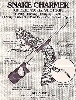 The Snake Charmer was introduced in 1978, by H.Koon, Inc, of Dallas, Texas.[1][2] It originally sold for $89.95[2] and was marketed as a general purpose utility shotgun perfect for "Fishing - Hunting - Camping - Back Packing - Survival - Home Defense - Truck or Jeep Gun."