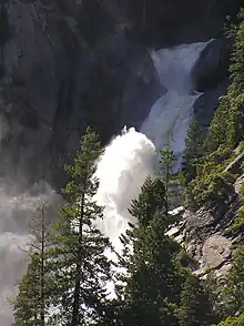 Snow Creek Falls is a long series of cascades located in Yosemite National Park toward the eastern extent of Yosemite Valley. It descends a steep gorge on a sizeable stream that originates in May Lake to the north, dropping east of the trail that leaves the Valley above Mirror Lake en route to North Dome and other north-rim destinations. Snow Creek Falls is the second highest waterfall in Yosemite National Park.