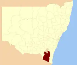 The council comprises an area of 15,162 square kilometres (5,854 sq mi) and occupies the higher slopes of the eastern side of the Great Dividing Range between the Australian Capital Territory to the north and the state boundary with Victoria to the south. At the time of its establishment the council had an estimated population of 20,707.[1] Its population at the 2016 census was 20,218.[3]