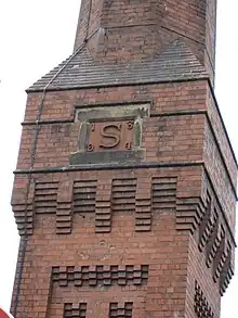 The red brick chimney is located behind The Nag's Head on Tuttle Street[3] and is considered a Wrexham landmark. It is a visible companion to the nearby St Giles' Church which both can be seen from afar alongside each other.[4][5] The chimney marks the site of one of the 19 former breweries located in Wrexham in the 1860s.[6][7]