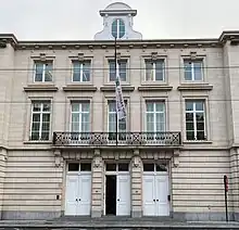 Immediately after its creation in 1822, the company acquired for its head office the former Brussels branch (French: refuge) of Averbode Abbey, at Warandeberg (rue Montagne du Marc) 3, a neoclassical structure designed by Barnabé Guimard and built in 1779-1781, which had become known as the Hotel Wellington following a sojourn by Arthur Wellesley, 1st Duke of Wellington in June 1815 just before the Battle of Waterloo.[1]:12 The SGB subsequently expanded to other adjacent structures. After rue Ravenstein was created in 1911-1913 as part of the construction of Brussels' North–South connection, the SGB's premises were expanded southward with a Beaux-Arts wing bordering the new street all the way to what is now rue Baron Horta, designed by Jacques Van Mansfeld.[5]
