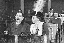 When back in Spain, Casanova resumed her literary works with renewed zeal. In 1909, she published Más que amor, a romance novel featuring a widowed Spanish woman living in Poland; the work contained barely veiled references to her own bitter experiences. Other novels falling into the similar genre were Princesa del amor hermoso (1909), El pecado (1911), Exóticas (1913), and El crimen de Beira-Mar (1914). La mujer española en el extranjero (1910) was a set of essays exploring cultural differences and again heavily based on her personal record. Her name started to feature regularly in literary sections of Spanish papers, herself counted among the mujeres ilustres ('distinguished women') of the literary world.[33] Her photo was splashed on the front pages of illustrated periodicals.[34] She tried also to go beyond the world of literature and pursued her interest in charity and education; she presided over the Madrid Comite Femenino de Higiene Popular.[35]