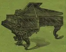 Hugo Sohmer marketed the first modern "bijou," or baby grand piano, built with a symmetrical case design which he patented in 1884.[8] "Only five feet long," these pianos were advertised as "the smallest grand ever manufactured,"[9] having "great power and volume of tone, together with the tone-sustaining quality and elastic touch heretofore only found in the concert grand."[10] The company also patented improvements in agraffe bars and actions in 1882, and in 1887 an agraffe for a quadruple strung "reverbation scale" and a pianissimo pedal in uprights, and bridge agraffes in 1890.[11]