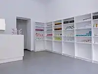 Darookhaneh Apotheke Pharmacy[14] was a collaborative project between Kashani and London-based artist Anahita Razmi.[15] It comprised a large installation filled with Iranian pharmaceuticals and medication packages at uqbar projectspace[16] in Berlin and an online conversation platform for discussing global imbalances in health economies and logistics.[17] Transcultural (dis)connections, inequalities in distribution, pharma-economic power dynamics, trade restrictions, and legal obstacles were some of the topics echoed in the exhibition.[18]