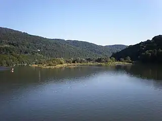 ![]() Lake Międzybrodzkie on the Soła river at the foot of Międzybrodzie Bialskie village, located 30 kilometres (19 mi) south of Auschwitz; about half-an-hour drive along Road DW 948 |