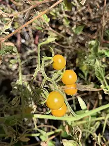 It often gets confused with the other native species, Solanum galapagense, which is similar but slightly different having more bushy smelly foliage and having smaller hairier orange fruits. It also gets confused with natural [Domestic tomato x S. cheesmaniae] hybrids and [Solanum pimpinellifolium x (S. cheesmaniae or S. galapagense)] hybrids because of introduction of domestic tomatoes to the Galapagos Islands, and the presence of Solanum pimpinellifolium on the islands and natural hybridization occurring between them.[1] Although listed as a Least-concern species by the IUCN, recent observations suggest the species may in fact be threatened.[1]