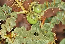 Solanum petrophilum leaves are 2-8 cm long ovate-lanceolate to oblong in shape, usually greyish-green in colour on the upper leaf and greenish-white to grey or yellow on the lower leaf surface.[2][4] The leaf margin has 3-6 undulating shallow or deep rounded lobes and has a truncate to cordate base.[2][4][5] The prickles occur on the mid-vein of the leaf and sometimes on the mid-vein and lateral veins.[5]