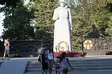 The Soldier Memorial was opened in 1968, the day of the 25th anniversary of the liberation of the region from the German fascist invaders. The composition was created by the sculptor Perfilov V.I. Collective farms, state farms and other institutions of the district took part in the construction of the monument. The names of the natives of Matveev Kurgan who died on the fronts of the Great Patriotic War are immortalized on 40 granite plates. Description of the monument: in the centre, above the mass grave, there is a sculpture of a soldier in a grey greatcoat, in a steel helmet with a gun over his shoulder. The height of the monument is 7 meters. The Memorial is made of concrete, ring casting. Different episodes of the Great Patriotic War are depicted on the right and left of the soldier's sculpture: the family is seeing off the fighter to the front, the mother is mourning her son, the soldiers are going to attack, a meeting of soldiers- winners with civilians, Victory Day, the Order of Victory. The names of the natives of Matveev Kurgan who died on the fronts of the Great Patriotic War are immortalized on the granite plates.[1] More than 600 people were buried in the mass grave.[2] The locals respect the past of the Fatherland, the historical events of the Great Patriotic War, the history of the small homeland, care for the monuments and memorials of the dead soldiers, keep the traditions and pass them on to future generations. On Victory Day and other memorable days this monument is a place of worship.