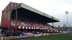 The main stand at Solitude, situated on the western side of the ground, is for Cliftonville supporters only. It is now a very old structure, having been constructed during the 1950s.[10] It has two tiers. The lower tier is terracing and seating, and the upper tier has a mixture of seating and benches. Its capacity is over 2,500 people.