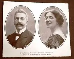 In 1910, Krushelnytska married Italian attorney and the mayor of Viareggio, Alfredo Cesare Augusto Riccioni.[11] In 1920, at the height of her career, she left the opera world, and three years later started concert tours, performing in Western Europe, Canada and the USA. Her knowledge of eight languages allowed her to include in her concert programs songs of many nations. She was a fervent promoter of Ukrainian folk songs and works by Ukrainian composers.