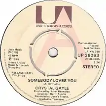 "Somebody Loves You" is a song written by Allen Reynolds, and recorded by American country music artist Crystal Gayle. It was released in December 1975 as the first single and title track from the album Somebody Loves You.