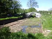 Excavations began in May 2014 at Terminus Bridge; the abutments were found to be in poor condition; an earth bund between the abutments carried the public footpath and stopped the water draining from the Paulton and Timsbury Basins. A new earth bund was installed about 25 m (27 yd) west of Terminus Bridge to stop the water and allow work to continue on the bridge.[30]
