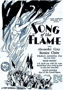 Song of the Flame is a 1930 American pre-Code musical film photographed entirely in Technicolor. Based on the 1925 operetta of the same name, the film features a screenplay by Gordon Rigby adapted from the musical book written by Oscar Hammerstein II and Otto A. Harbach for the operetta. The movies also features many of the songs from the operetta which used lyrics by Hammerstein and Orbach and music by George Gershwin and Herbert Stothart. The film was produced and distributed by First National Pictures. It was the first color film to feature a widescreen sequence, using a process called Vitascope, the trademark name for Warner Bros.' widescreen process. The film, based on the 1925 Broadway musical of the same name, was nominated for an Academy Award for Sound Recording (George Groves).[2] It is part of the tradition of operetta films, popular at the time.