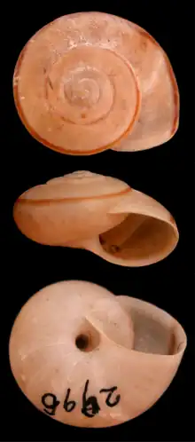 Like other species of the genus, the shell of S. neglecta is a little flatter than spherical, pale brown in colour with a chestnut peripheral band. Distinctive features of the shell are its relatively small size (15–17 mm diameter, c. 9 mm high), an umbilicus about a seventh of the diameter, and the surface sculpture of the protoconch.[1][8] The type specimen is now in the Natural History Museum of Los Angeles County (LACM 1451).[9]
