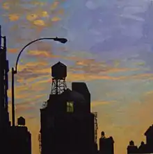 Her more recent works, while still exploring these themes, have delved into greater detail and prominently feature scenes with figures and rooftops. A 2009 New York exhibition of Sklaroff's work was praised for its unique color contrasts, light reflections, shadow depictions, and atmospheric qualities.[8] Although she has painted various landscapes and interiors, she is particularly renowned for her depictions of New York City, especially her portrayals of the city's water towers, which exude an almost anthropomorphic character.[8] Many of her landscape paintings originate from Maine or the American Southwest, and she has been an artist in residence at the Santa Fe Art Institute.[9] Sklaroff continues the longstanding tradition of artists painting on Monhegan Island, Maine, a remote location she visits annually.[10][11]