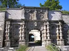 The Renaissance portal of Wülzburg Castle shows George Frederick's coat of arms next to Sophie's.[6]