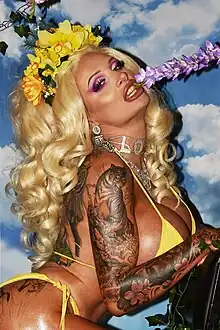 Anderson died in late November 2023 at the age of 36 in Basingstoke, two weeks after the death of Spedding.[51][52][53] Her death was announced on 4 December by Rebecca More in a statement on Instagram.[54] More paid tribute to Anderson, describing her as a "bubbly, funny, kind hearted soul who was outrageous on the outside but also so gentle behind closed doors" [...] adding that they "shared a crazy time together that was totally unique to [them]" and that Anderson would hold a special place in [her] heart.[55][56][57][58] Several members of the LGBTQ+ community also paid tribute to Anderson, including RuPaul's Drag Race UK finalist Divina de Campo who memorialised her as "outrageous [...] but incredibly sweet" and a "continuous advocate for those in the LGBTQ+ community and [the pornography] industry, as well Terrence Higgins Trust, a HIV and sexual health charity that Anderson had advocated for in the past; who said they were "so sad to hear of her death".[59][60] Brazzers described Anderson as an "icon who brought so much joy to so many", whilst Men.com said she was an "ultimate ray of light [...] who embodied the kind of liberation and generosity towards oneself that [everyone] should aspire to."[61][62][63]