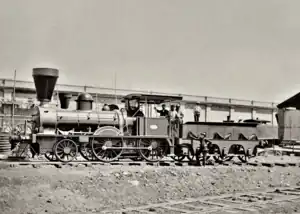 One of the first three South Australian Railways locomotives, photographed between 1869, when they were converted from well tank to tender configuration to increase their coal and water capacity, and 1871–1874, when they were withdrawn. The locomotive is standing on inverted U-shaped "bridge rails", without fishplates.