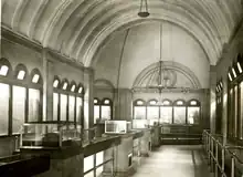 Originally intended to be cruciform-shaped like a church with a central nave and two apses, the aquarium building was ultimately L-shaped without the west apse.[4] A bronze weathervane in the shape of a cod topped the domed nave.[7] Inside, from behind brass railings, visitors could view 55 wooden tanks, lit by natural sunlight during the day and electricity after dark, through plate glass windows.[7][4] A large pool for Atlantic harbor seals, with a chandelier hanging overhead, occupied the area under the dome, and the gallery of smaller tanks exhibited saltwater and freshwater fishes and turtles.[4] The freshwater exhibits were supplied by city water, while a reservoir of seawater pumped in from Boston Harbor supplied the saltwater exhibits.[4]