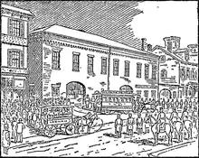Drawing of a South Boston Railroad horsecar departing from the Broadway Carhouse while under police guard, during the 1887 strike