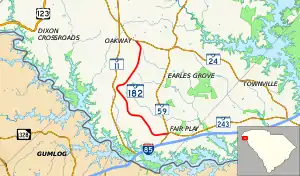 South Carolina Highway 182 (SC 182) is a 9.580-mile-long (15.418 km) state highway in the U.S. state of South Carolina. The highway connects Fair Play and Oakway.