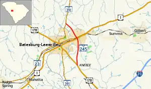 South Carolina Highway 245 (SC 245) is a 5.060-mile-long (8.143 km) state highway in the U.S. state of South Carolina. The highway was built and paved in 1932 as a short spur of SC 24 passing north through Leesville to connect with SC 391.[2] Since being built, that section of SC 24 was redesignated as US 178 in 1933, and Leesville merged in 1992 with Batesburg, where US 1 and SC 391 intersect, to form the town of Batesburg-Leesville. It is known locally as North Lee Street north of the railroad tracks, and as South Lee Street south of the railroad tracks. There are two traffic lights along SC 245.[3]