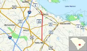 SC 310 begins at an intersection with US 176/SC 453 Truck in Holly Hill. The highway heads north concurrently with SC 453 Truck to a roundabout with SC 45, north of the city. Here, the truck route follows SC 45, while SC 310 continues to the north. It enters the city of Vance, where it intersects SC 210. After leaving Vance, SC 310 heads northwest and meets its northern terminus, an intersection with SC 6, just northwest of the city.[2]