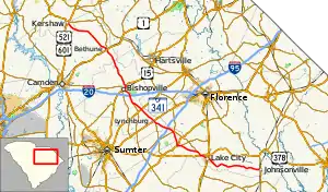South Carolina Highway 341 (SC 341) is a 93.870-mile (151.069 km) state highway that travels through the northeastern part of the U.S. state of South Carolina. It travels diagonally from the southeast to northwest (but signed as north–south) from SC 41 and SC 51 in Johnsonville to U.S. Route 521 Business (US 521 Bus.) and US 601 Bus. in Kershaw.