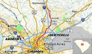 SC 555 traverses 14.67 miles (23.61 km) from SC 12 in downtown Columbia to U.S. Route 21 (US 21) near Blythewood. Before Interstate 77 (I-77) was completed in the area, SC 555 served as a major thoroughfare; today it is an alternate route. The highway is four lanes south of I-77 and two lanes north of it.[2]