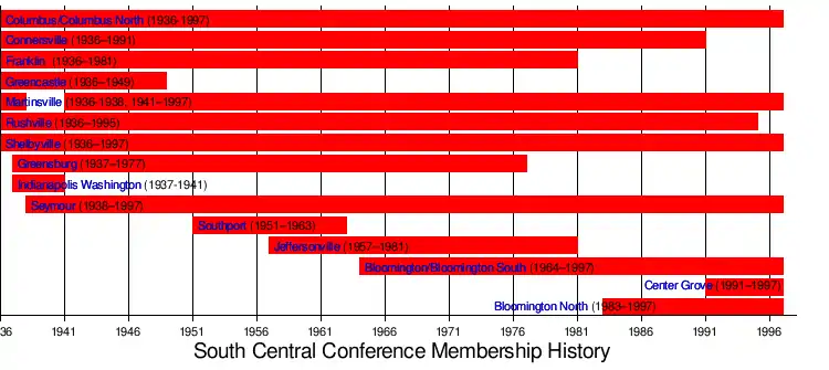 The South Central Conference was an IHSAA-sanctioned conference from 1936 to 1997.[1] The conference began as a collection of schools in mid-sized and large cities in South Central and Southeast Indiana, expanding into both Indianapolis (Washington and Southport) and far Southern Indiana (Jeffersonville). The conference had been as big as 10 in the 1950s, but was down to six schools in the 1980s. With Connersville and Rushville leaving in the advent of class basketball, being replaced by Bloomington North and Center Grove, the conference had shifted to a small conference of large schools. As class basketball was set to be introduced in the 1997-98 school year, the South Central and Central Suburban conferences, as well as large independent schools, decided to reorganize, giving way to Conference Indiana and the Metropolitan Interscholastic Conference.