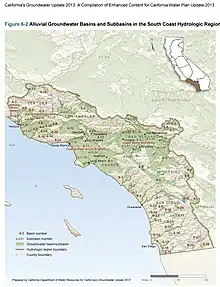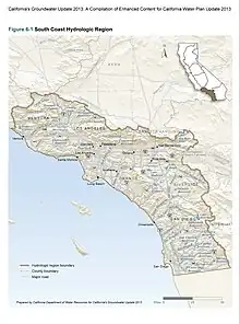 The South Coast hydrologic region of California is one of the 10 major hydrologic regions of the state as identified by the California Department of Water Resources. The South Coast hydrologic region has a surface area of about 11,100 sq mi (29,000 km2), and includes all of Orange County, major portions of Los Angeles, Riverside, San Bernardino, San Diego, and Ventura counties, and a small portion of Santa Barbara County.[1] The state-defined South Coast hydrologic region is roughly equivalent to the federally-defined Southern California Coastal water resource subregion. The South Coast hydrologic region has 78 state-recognized alluvial groundwater basins and subbasins.