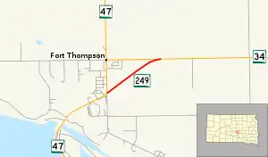 South Dakota Highway 249 (SD 249) is a state highway in the U.S. state of South Dakota that extends from SD 47 to SD 34 in Buffalo County. The entire highway is located within Fort Thompson and is maintained by the South Dakota Department of Transportation (SDDOT). It is not a part of the National Highway System.