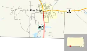 From its southern terminus SD 407 heads north along the eastern edge of, and then into, Pine Ridge. A few blocks after entering the main part of the community SD 407 reaches its northern terminus at an intersection with US 18 and BIA Route 32 (BIA Rd. 32). From the northern terminus of SD 407, US 18 heads easterly to Martin and Mission and northerly to Oglala and Hot Springs. BIA Rd. 32 heads westerly to terminate at BIA Route 41.[3][4] On average, SD 407 is driven by over 4,200 vehicles per day.[1]