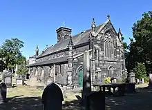 South Leith Parish Church, originally the Kirk of Our Lady, St Mary, is a congregation of the Church of Scotland. It is the principal church and congregation in Leith, in Edinburgh. Its kirkyard is the burial place for John Home[1] (author of Douglas) and John Pew, the man from whom the author Robert Louis Stevenson reputedly derived the character of Blind Pew in the novel Treasure Island.[2] The church has been repaired, used as an ammunition store and reconstructed[3] but still retains the basic layout of the nave of the old church.