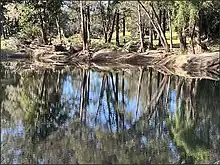 The South Pine River rises in the D'Aguilar Range below Mount Glorious near Highvale, northwest of Brisbane, and flows generally east, to form its confluence with the North Pine River at Lawnton, where the river forms the Pine River. The river flows mostly through the City of Moreton Bay; it is joined by Dawson Creek,[2] Samford Creek and Cedar Creek before snaking through the outer northwestern suburbs of Brisbane where it divides the suburbs of Eatons Hill and Brendale to the north and Albany Creek to the south. Meeting with Albany Creek in the suburb of the same name, it carries the city council boundary between the Moreton Bay City Council and the Brisbane City Council down to its confluence. To the northwest of the South Pine River are the Pine Rivers suburbs of Strathpine and Lawnton, while on the southeast are Brisbane City Council suburbs Bridgeman Downs and Bald Hills. The river descends 287 metres (942 ft) over its 41-kilometre (25 mi) course.[1] A sewage treatment plant is located at Brendale.[3]