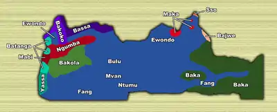 The Beti portion of the group is primarily situated in the Centre Province, but large numbers of Ewondo and Bane inhabit the Ntem and the Dja and Lobo divisions of the South.
