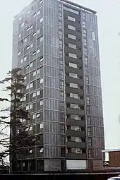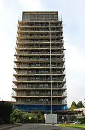 The stables and servants' quarters were demolished in 1961[5] and in 1964 a concrete tower extension was added to the hall, incorporating a bar and dining hall area. The tower contained 180  student rooms over its 17  floors and was 48.7 metres high,[23] making it the 10th-tallest building in Southampton in December 2017.[24] Despite some later claims to the contrary,[20] there is no contemporary evidence that these extensions were intended to be temporary.