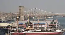 South Street was built on landfill in the latter part of the 17th century;[1] the city began to grade and pave it in 1798, creating a 75-foot border between houses and merchants' shops, and the wharves, slips and piers that had sprung up along the street; the width was necessary because the ships docked right against the shoreline, with their bowsprits sticking out into the street, giving it its nickname, the "streety o' ships".[2] In the early 19th century, South Street was created on additional landfill. South Street became the center of the city's shipping industry and water-based commerce for two hundred years; although by 1810 it was getting competition from West Street on the other side of the island.[3] In 1835, the Great Fire of New York destroyed 76 of the buildings on the street,[1] but that hardly kept back the expansion of commerce along the shoreline. On one day in 1836, there were 921 vessels on the East River waiting to load or unload onto South Street, while an additional 320 waited on the Hudson. At that time, New York City had 62% of the import business in the entire country.[4]