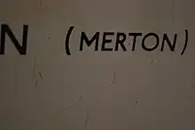 The station was opened on 13 September 1926 as part of the Morden extension of the City & South London Railway south from Clapham Common.[7] On the original plan it had the name "Merton Grove".[8] For geographical accuracy, the station was shown as "South Wimbledon (Merton)" on tube maps from 1928,[9] the name was also modified on platform signage, though not on the station building at street level. From the early-1950s, the "(Merton)" parenthetical fell out of use.[note 1]